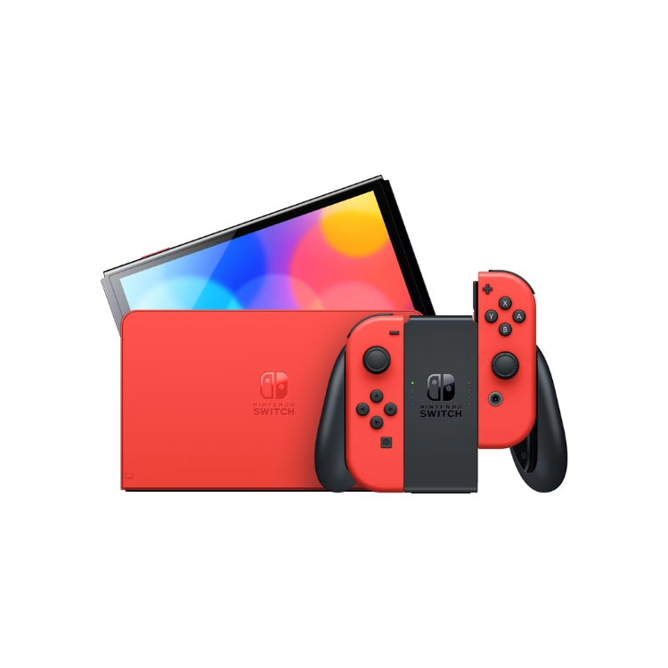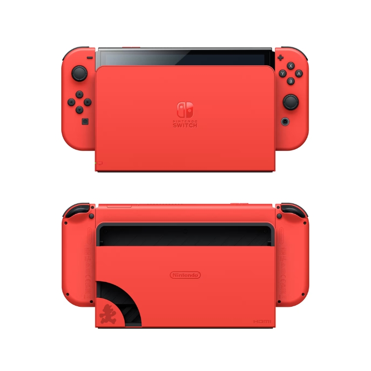 Nintendo Switch OLED Mario Red Limited Edition. Start your adventure with a switch limited edition system inspired by Mario. Warp into a world of games with this system that features a console, dock, and Joy-Con™ controllers all in the iconic Mario Red colour. A silhouette design of Mario jumps into action on the back of the dock. Look closely, and you’ll also find some hidden coins!